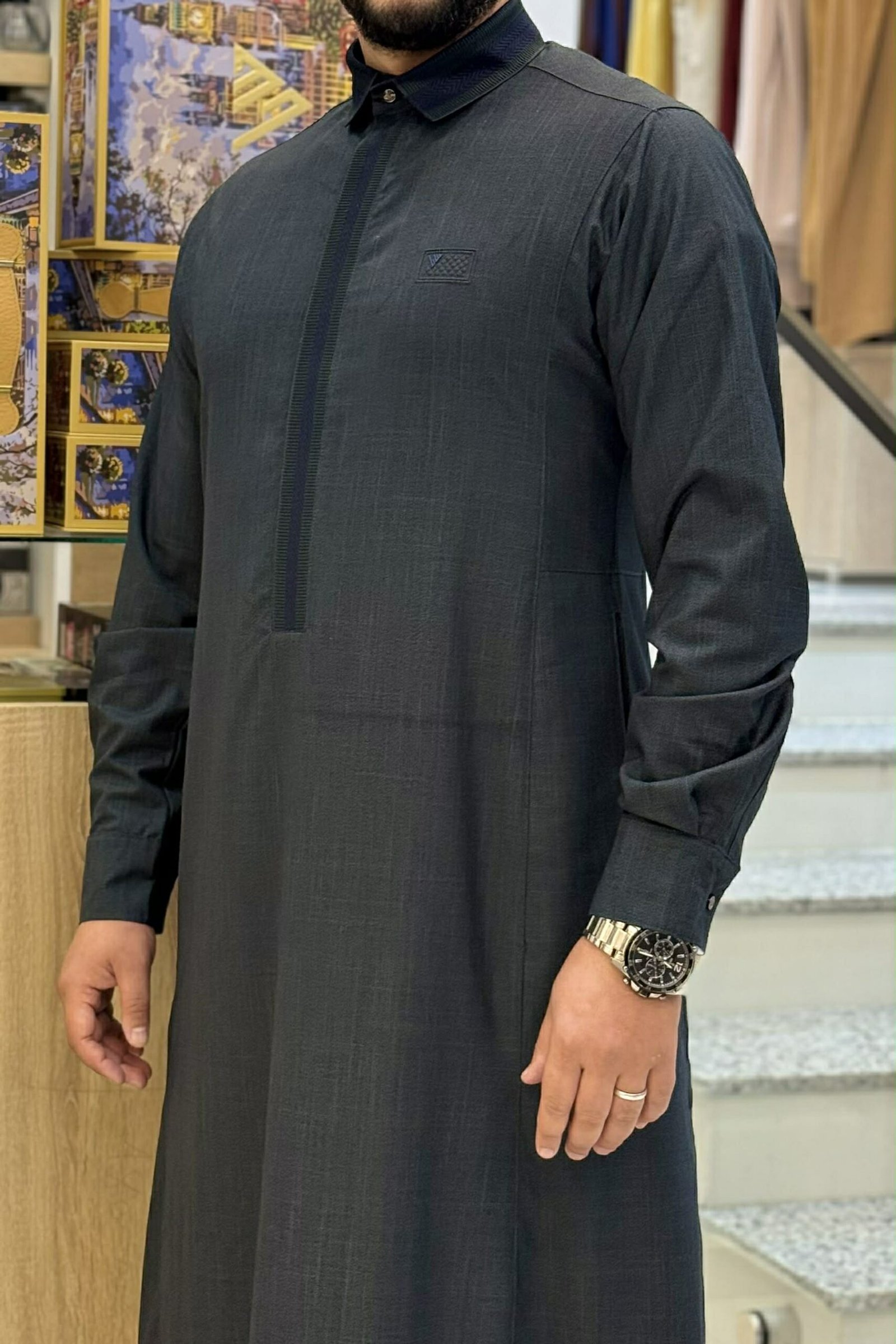 The AAR2653 Al Ameer Thobe delivers modern refinement with a confident, understated presence. Crafted from premium textured fabric, it features a contrasting woven placket, clean mandarin collar, and precise tailoring for a sharp, contemporary finish. Designed for comfort and durability, this piece reflects Arabian heritage elevated through British craftsmanship.